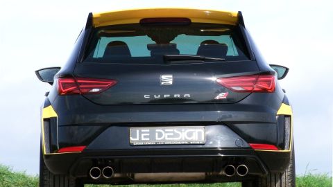 The JE DESIGN stainless steel exhaust with sound flap system provides an appropriately sporting soundtrack, and comes with EC and Swiss type approvals. The flap system is controlled via the OE Seat driving profile selection system. When the flap is closed (Comfort and Sport), the exhaust sounds subtly sporty, but in Cupra mode the system delivers a deep, sonorous sound. The exhaust silencer offers the choice of either four distinctive 80mm diameter outlets, or two oval tailpipes of 140 x 90mm or 160 x 90 mm dimensions per side.