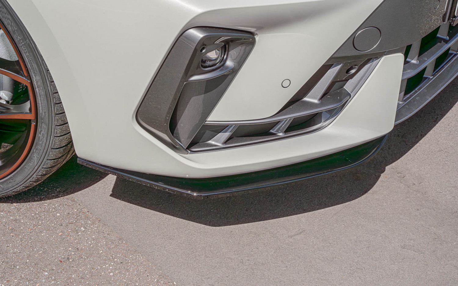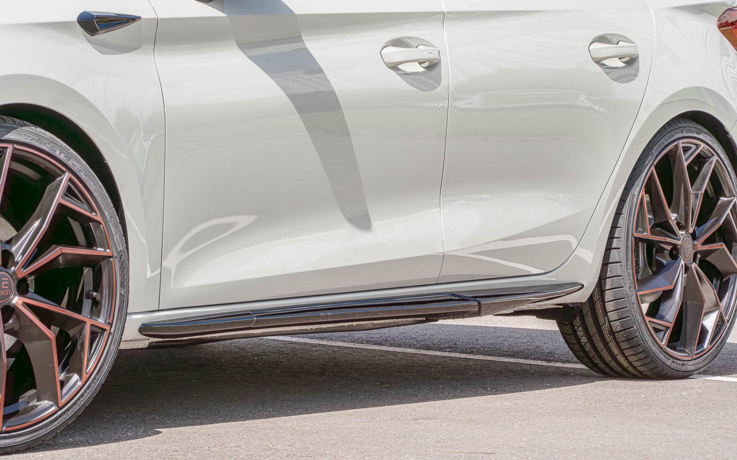 JE DESIGN has installed its in-house lowering springs with approx. 30 mm as well as Copper-R rims in 8 x 20 with 235/30 R 20 tires (18" or 19" also possible). In terms of design, the customer can choose between the Lucca (passenger side) or Rubi design (driver's side).