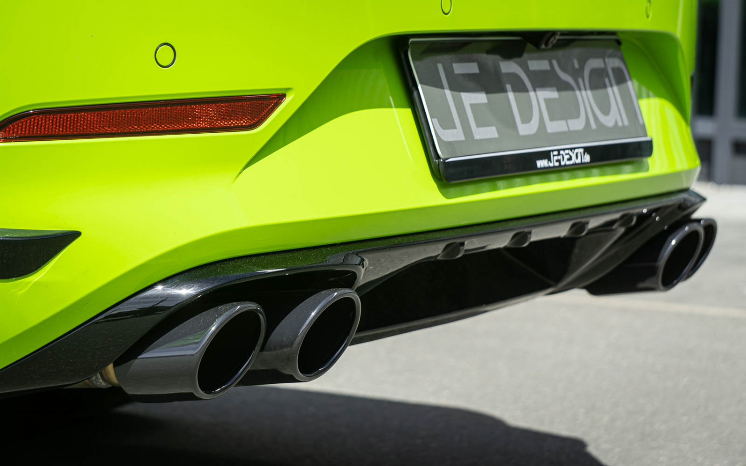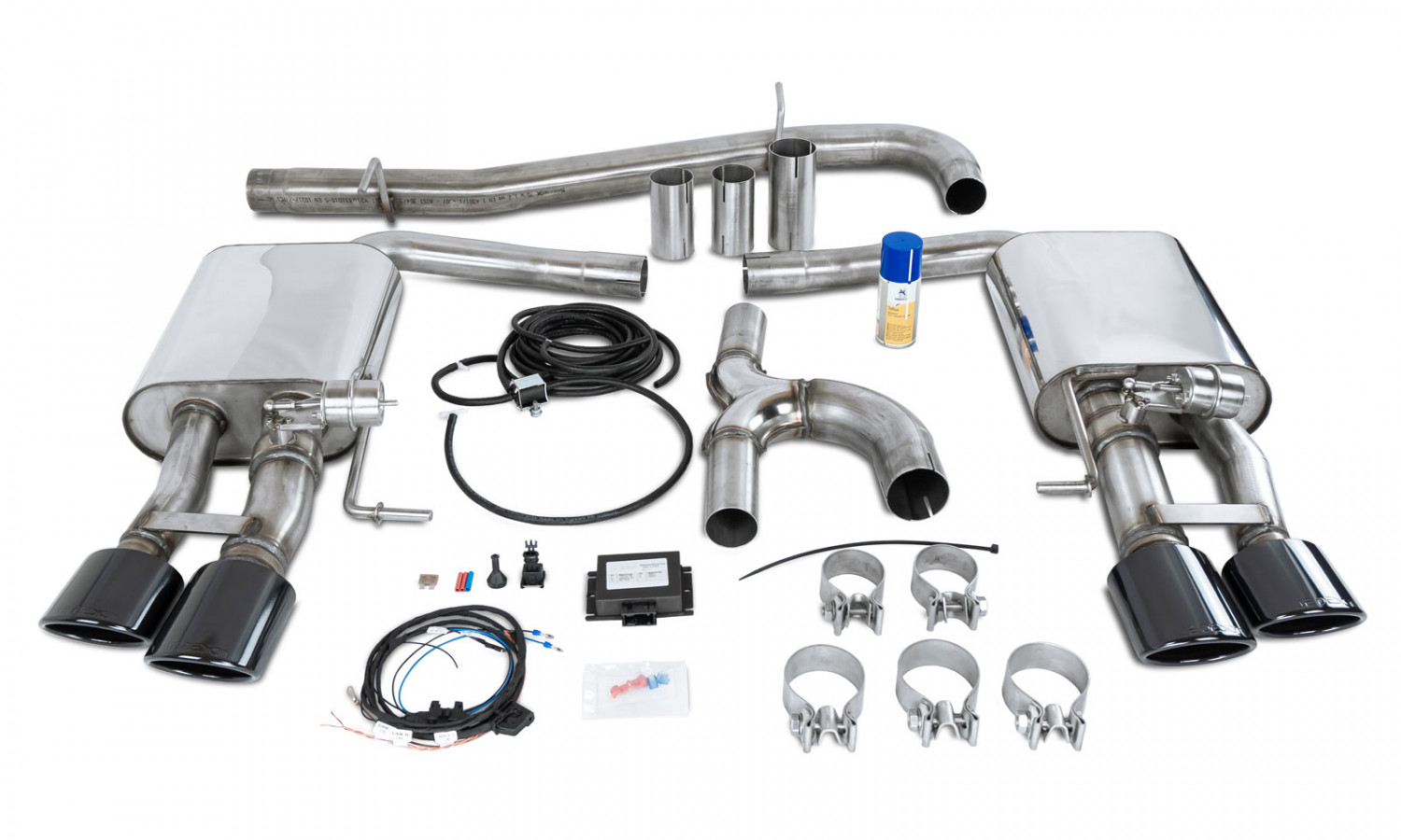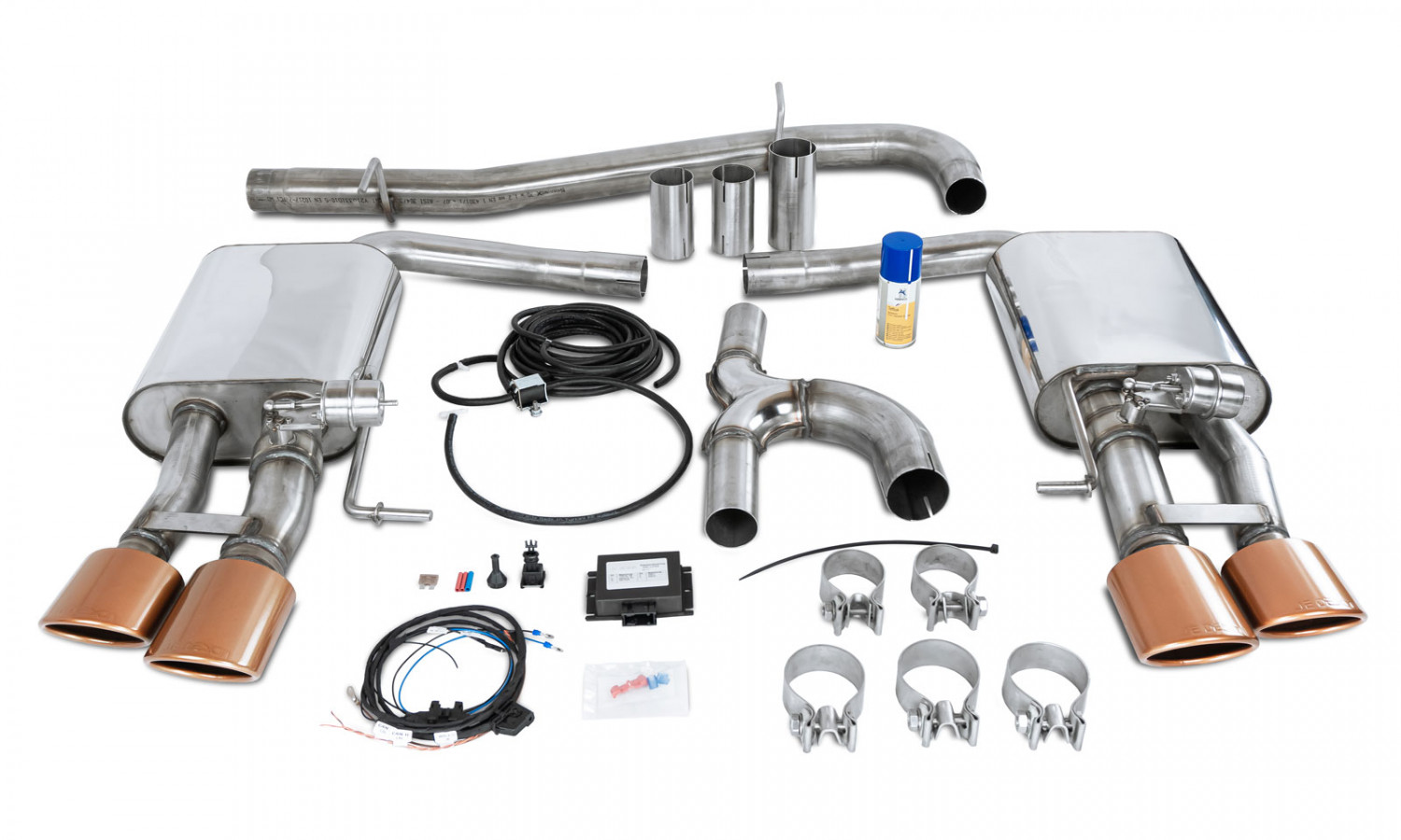 The flap system replaces the standard system after the OPF and has a consistent diameter of 70 mm up to the rear silencers. It consists of a connecting pipe with a T-piece, which leads left and right to the two rear silencers together with the exhaust flaps. The rear silencers each have 2 oval beveled tailpipes measuring 106 x 71 mm. These are available in black or copper and have a JE DESIGN logo embossed on the top. All parts are made of high quality stainless steel. The system also includes the CAN switch module for the flap control including a cable set with connector, hose and magnetic valve.