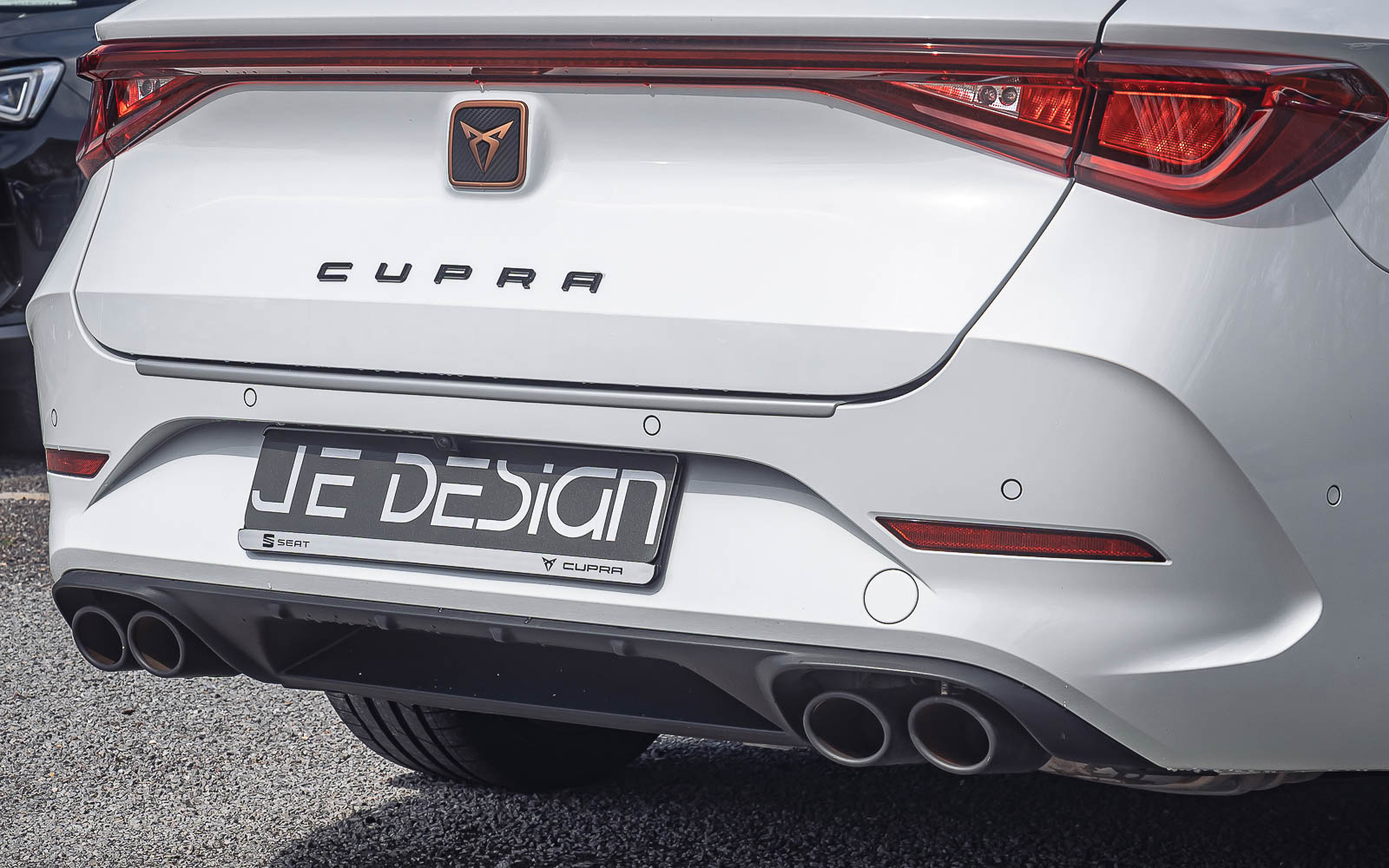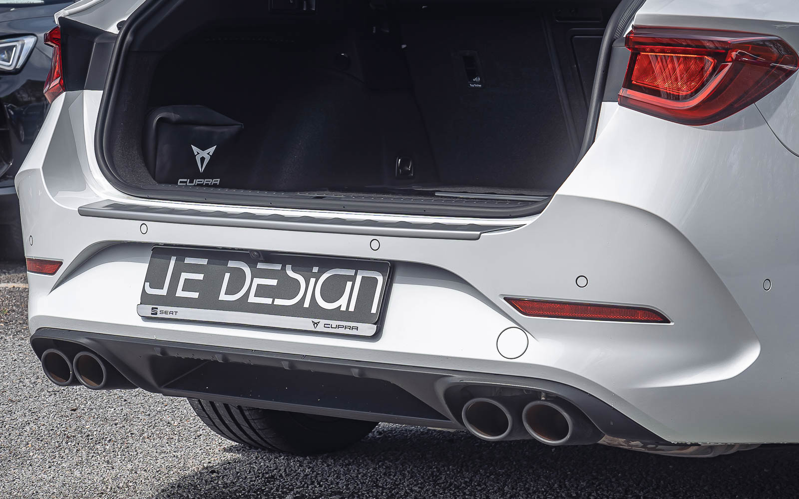 The rear bumper insert, with diffuser fins, fits perfectly in the rear view of the Leon. The insert can be installed on vehicles with 4-pipe exhaust system as well as on the plug-in hybrid models. Here, the standard exhaust dummy trims can be adopted. Sportiness does not exclude practical details at JE DESIGN. The Click diffuser system allows the center section to be unclipped without tools, allowing the trailer hitch to be swung down and thus remain usable.