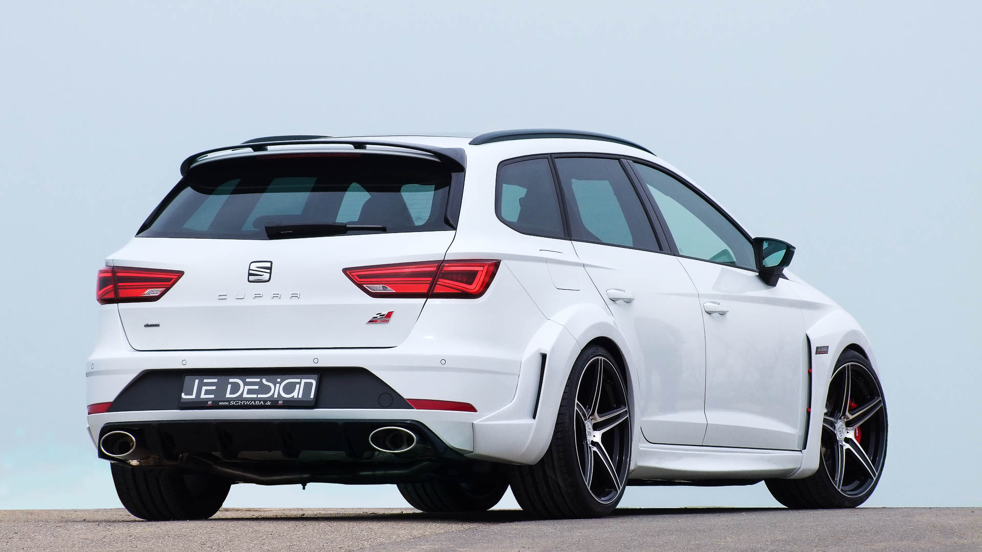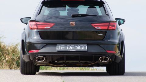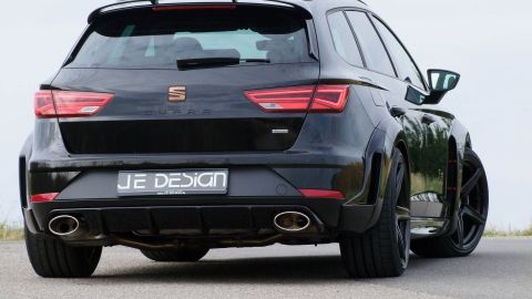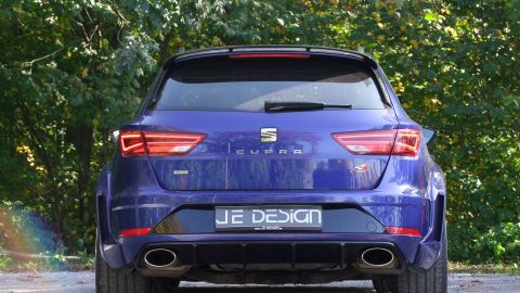 Kurz nach dem Marktstart schickt JE DESIGN den sportlichen Kombi in die „Muckibude“ und präsentiert maßgeschneiderte Komponenten, beispielsweise ein selbstbewusstes Breitbaukit. Markantes Markenzeichen des JE DESIGN Leon Cupra 300 ST Widebody sind natürlich die wuchtigen Verbreiterungen an den vorderen und hinteren Radläufen. Seitenschweller sorgen optisch für sportlichere Flanken. Der vordere Stoßfängeraufsatz ist mit Luftkanalblenden ausgestattet. Den Heckeinsatz von JE DESIGN können Interessenten wahlweise in Schwarzglanz oder im Carbon-Look bestellen. Zum Aerodynamikpaket gehört ferner ein sportlicher Heckspoileraufsatz. Der JE DESIGN-Widebodykit kann ab sofort bestellt werden.